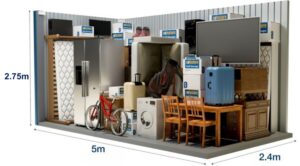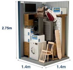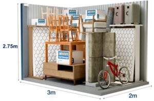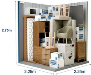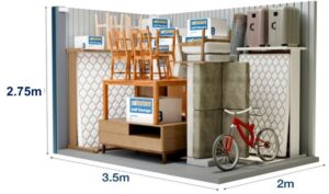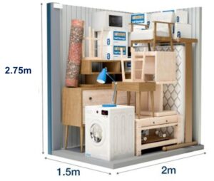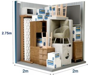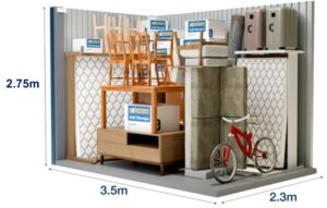 Στην αποθήκη αυτή είναι δυνατή η εναποθήκευση των επίπλων ενός μικρού διαμερίσματος δύο υπνοδωματίων (τριάρι). Ο εν λόγω αποθηκευτικός χώρος είναι επίσης ιδανικός για τη φύλαξη των εμπορευμάτων ή του εξοπλισμού μίας μικρής επιχείρησης. Οι διαστάσεις στην παρακάτω φωτογραφία είναι ενδεικτικές.